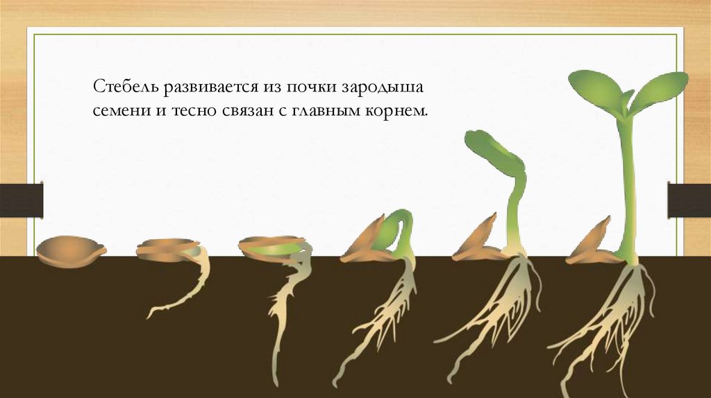 Стебель развивается из почки зародышасемени и тесно связан с главным корнем.