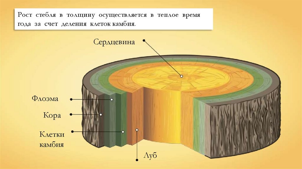 Рост стебля в толщину осуществляется в теплое времягода за счет деления клеток камбия.