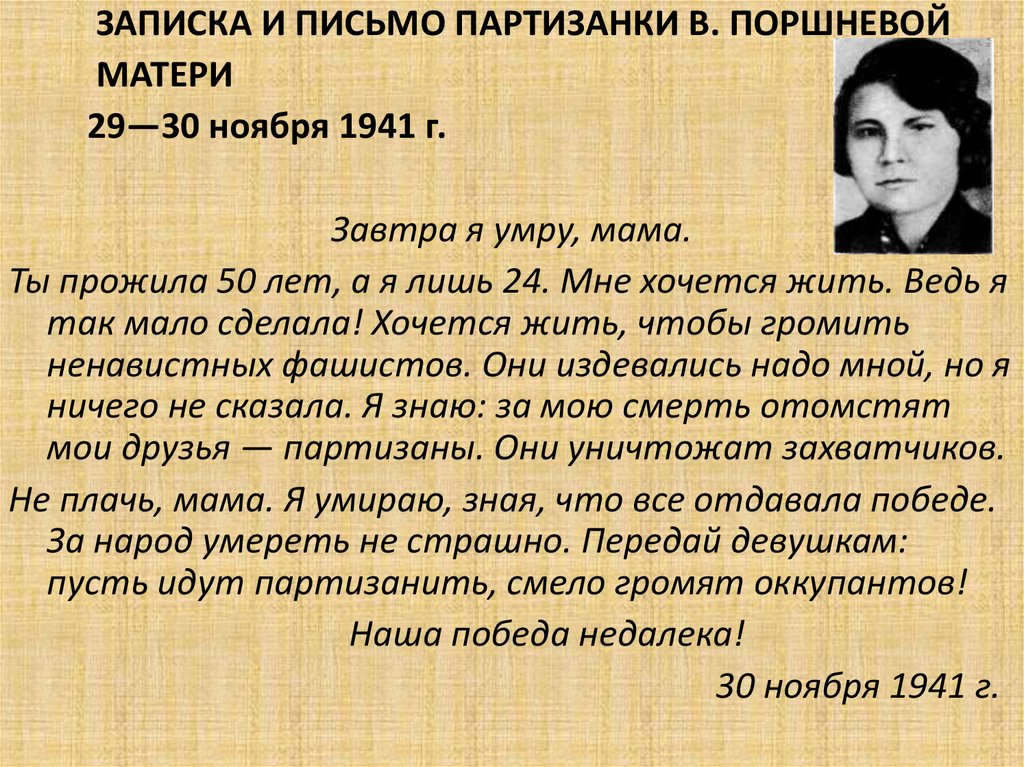 ЗАПИСКА И ПИСЬМО ПАРТИЗАНКИ В. ПОРШНЕВОЙМАТЕРИ