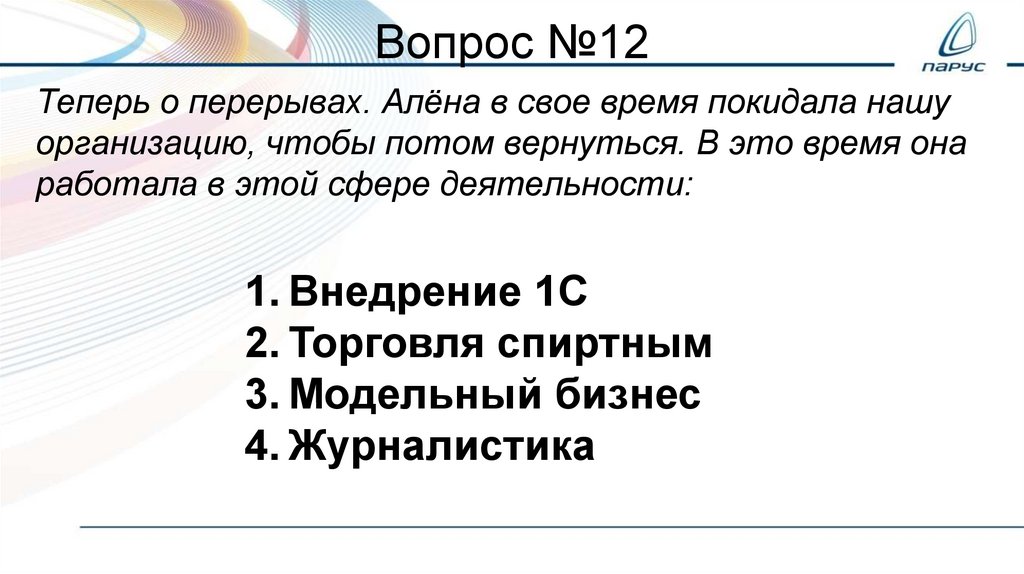 Вопрос №12Теперь о перерывах. Алёна в свое время покидала нашу