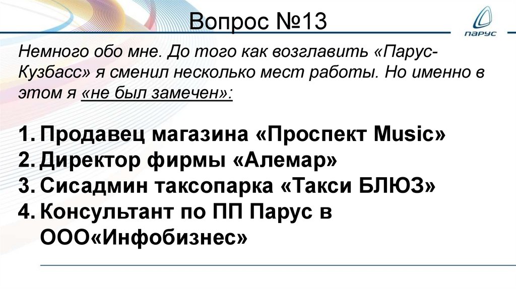 Вопрос №13Немного обо мне. До того как возглавить «ПарусКузбасс» я сменил несколько мест работы. Но именно в