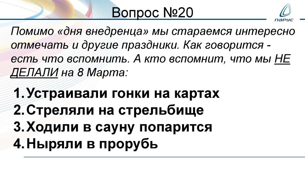 Вопрос №20Помимо «дня внедренца» мы стараемся интересно