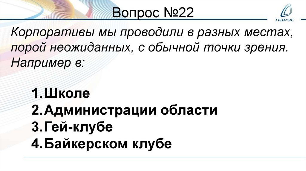 Вопрос №22Корпоративы мы проводили в разных местах,