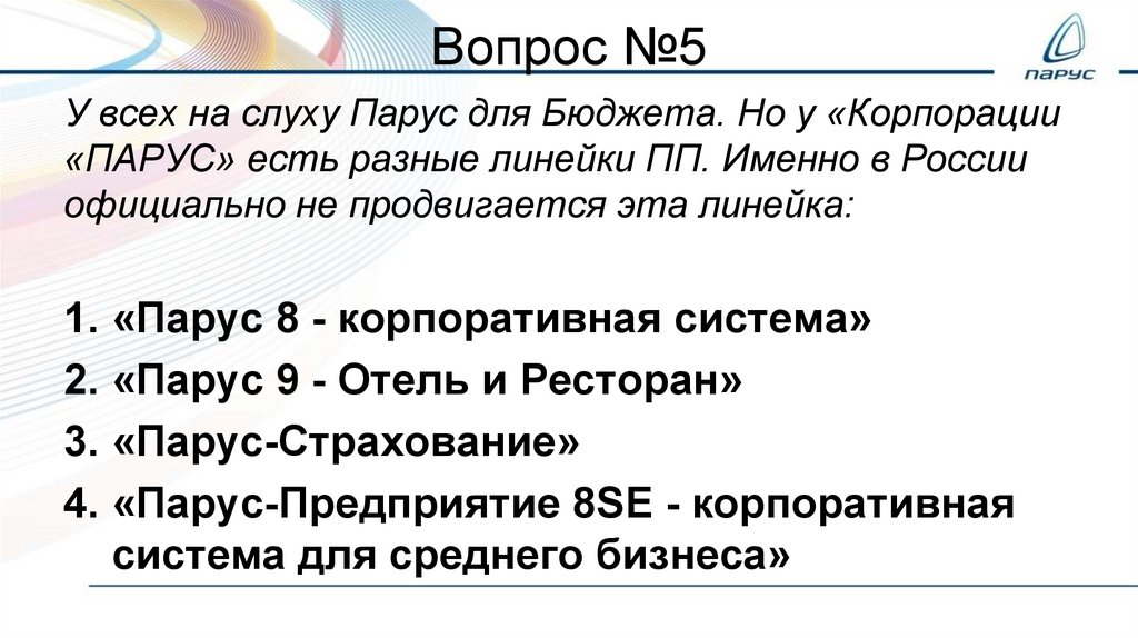 Вопрос №5У всех на слуху Парус для Бюджета. Но у «Корпорации