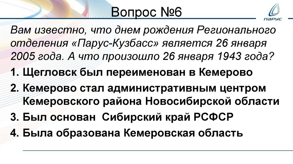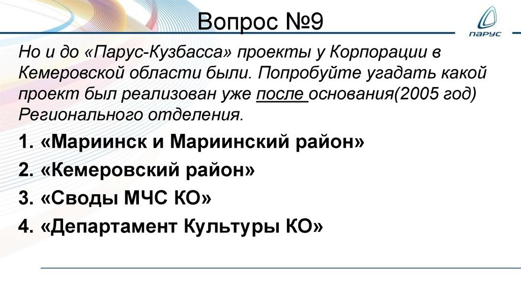 Вопрос №9Но и до «Парус-Кузбасса» проекты у Корпорации в