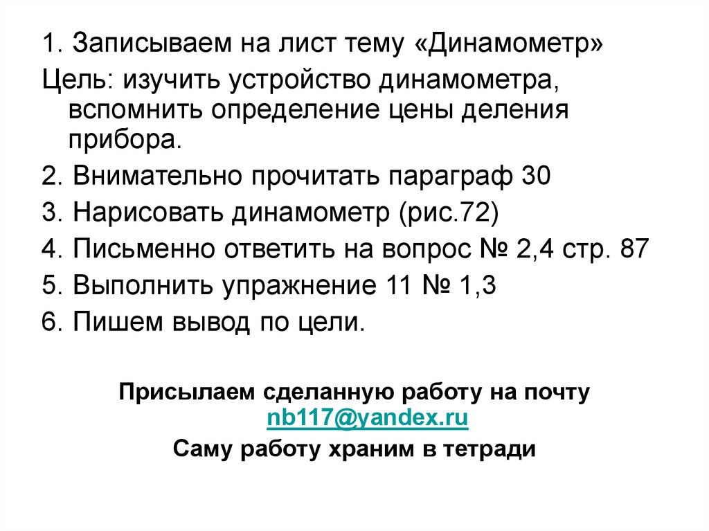 1. Записываем на лист тему «Динамометр»Цель: изучить устройство динамометра,