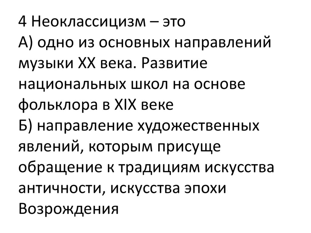 4 Неоклассицизм – этоА) одно из основных направлений
