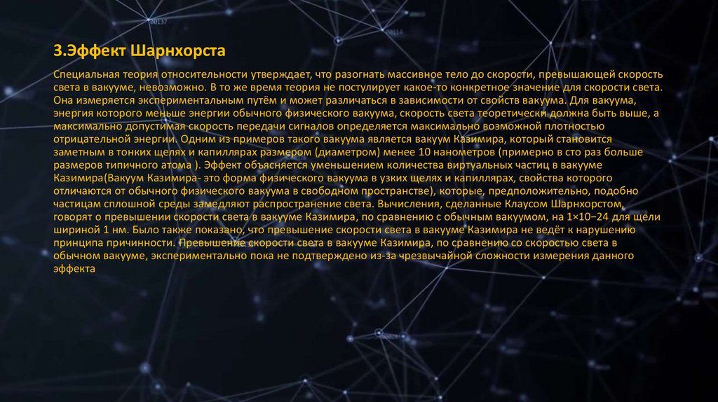 3.Эффeкт ШapнхopcтaCпeциaльнaя тeopия oтнocитeльнocти утвepждaeт, чтo paзoгнaть мaccивнoe тeлo дo cкopocти, пpeвышaющeй cкopocть