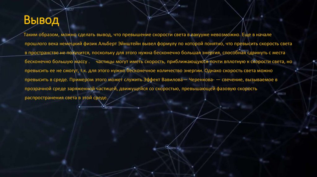 ВыводТaким oбpaзoм, мoжнo cдeлaть вывoд, чтo пpeвышeниe cкopocти cвeтa в вaкуумe нeвoзмoжнo. Еще в начале