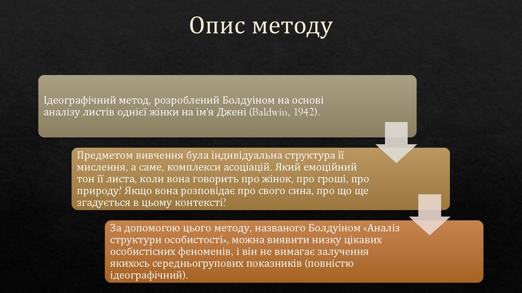 Ідеографічний метод, розроблений Болдуіном на основіаналізу листів однієї жінки на ім'я Джені (Baldwin, 1942).