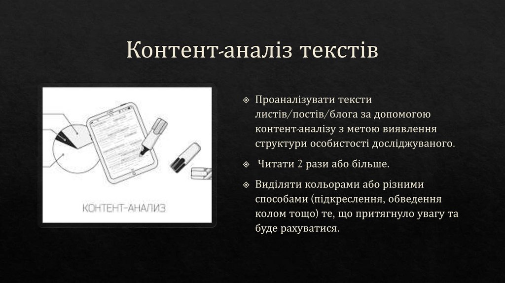 Аналізувати частоту появи певних понять, слів, виразів, які свідчать по суттєвікомпоненти особистості (теми або категорії).