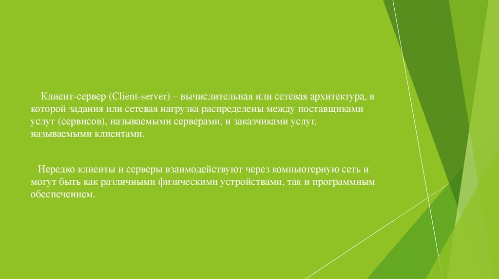Клиент-сервер (Client-server) – вычислительная или сетевая архитектура, вкоторой задания или сетевая нагрузка распределены между поставщиками