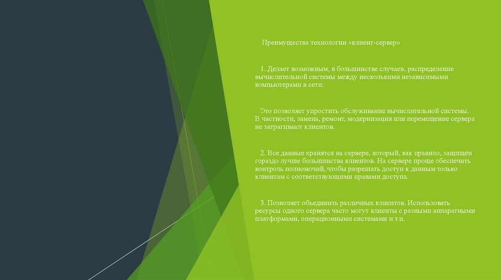 Преимущества технологии «клиент-сервер»Делает возможным, в большинстве случаев, распределение