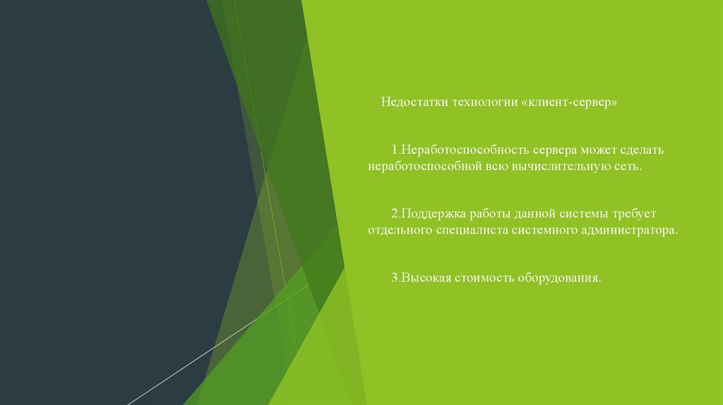 Недостатки технологии «клиент-сервер»1.Неработоспособность сервера может сделать