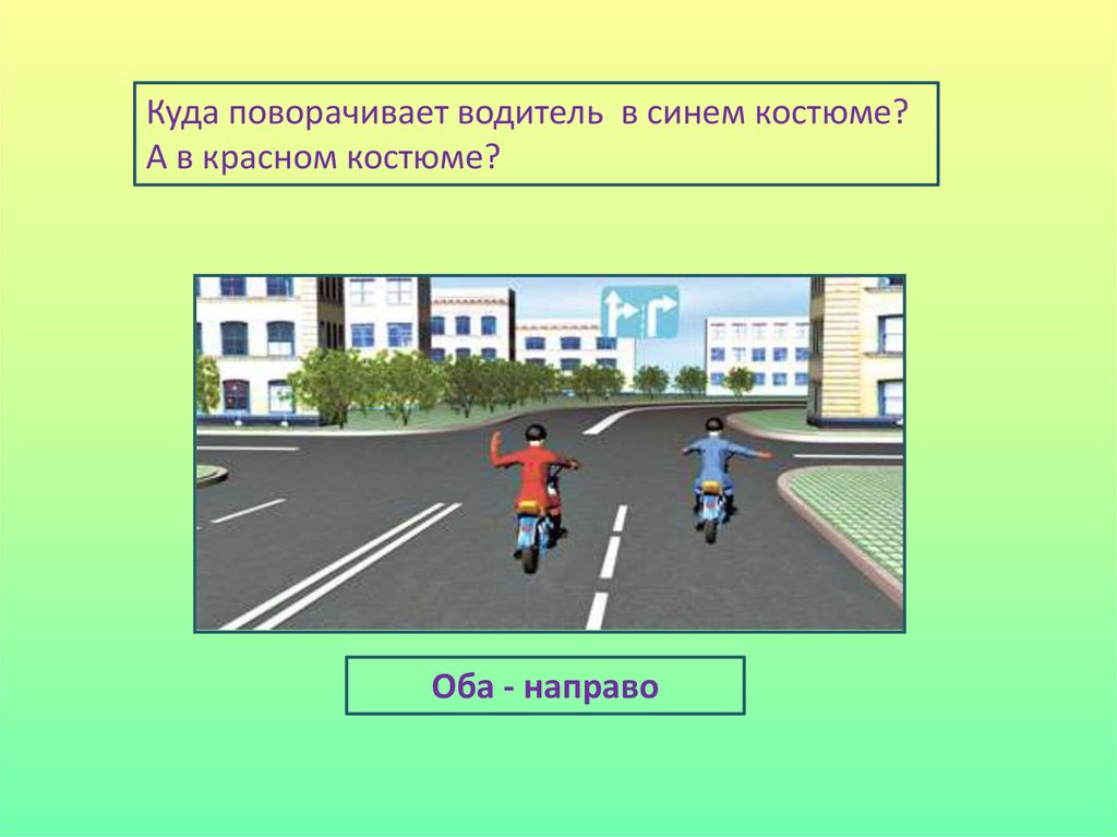 Куда поворачивает водитель в синем костюме?А в красном костюме?