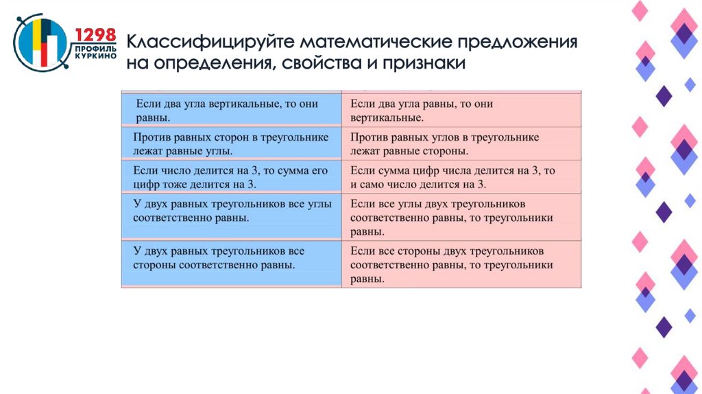1) В равнобедренном треугольнике углы при основании равны;