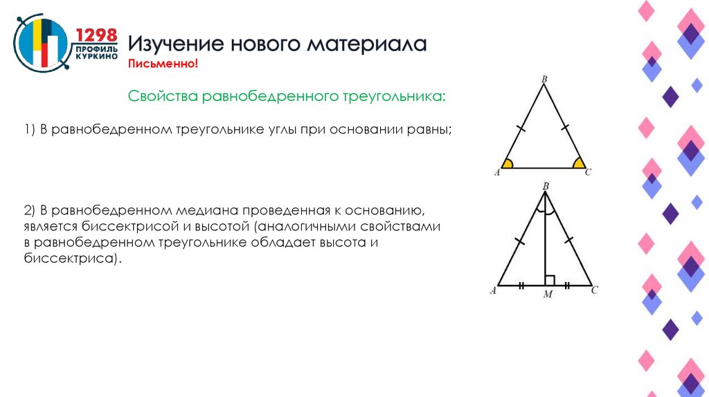 Письменно!Свойства равнобедренного треугольника: