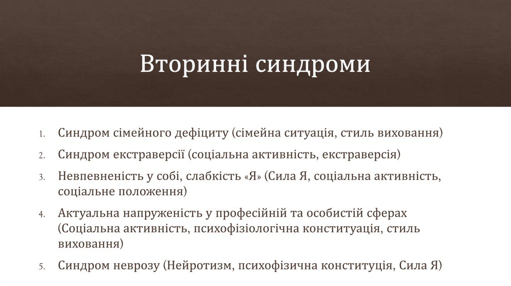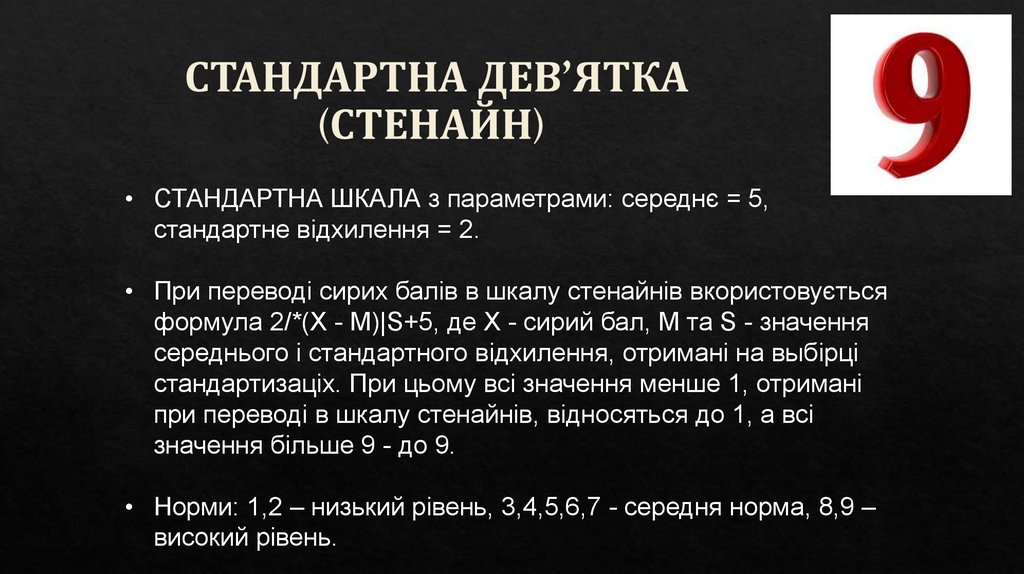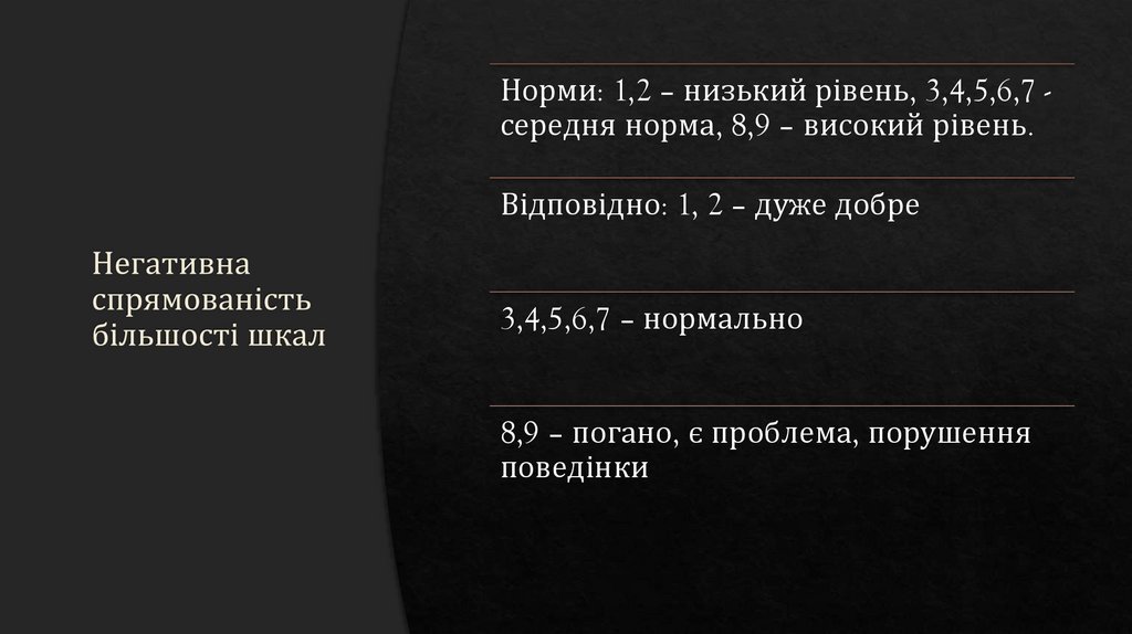• Норми: 1,2 – низький рівень, 3,4,5,6,7 - середня норма, 8,9 –