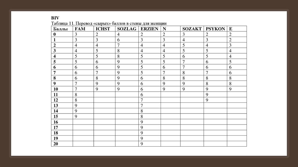 BIVТаблица 11. Перевод «сырых» баллов в стены для женщин