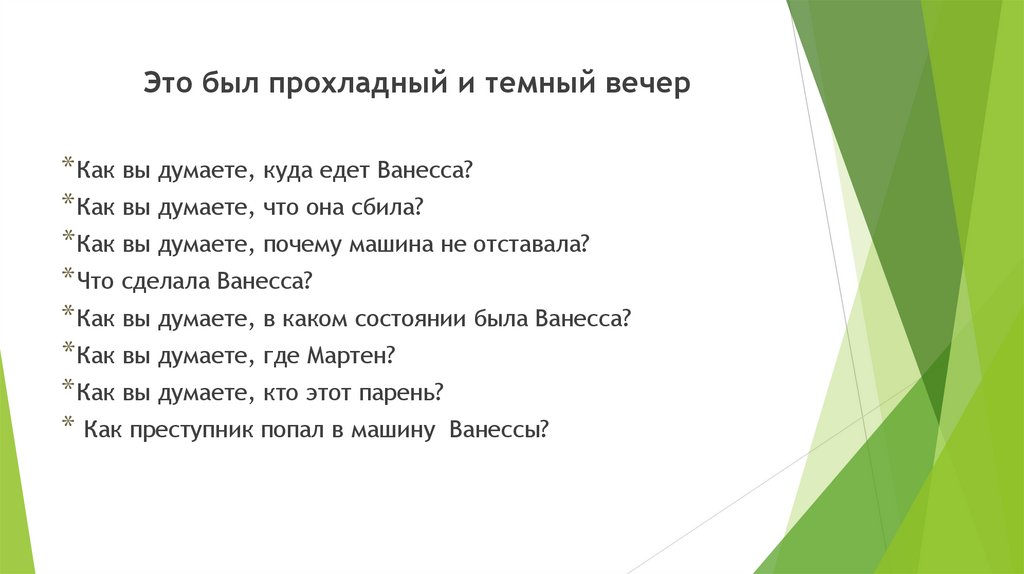 Это был прохладный и темный вечер* Как вы думаете, куда едет Ванесса?