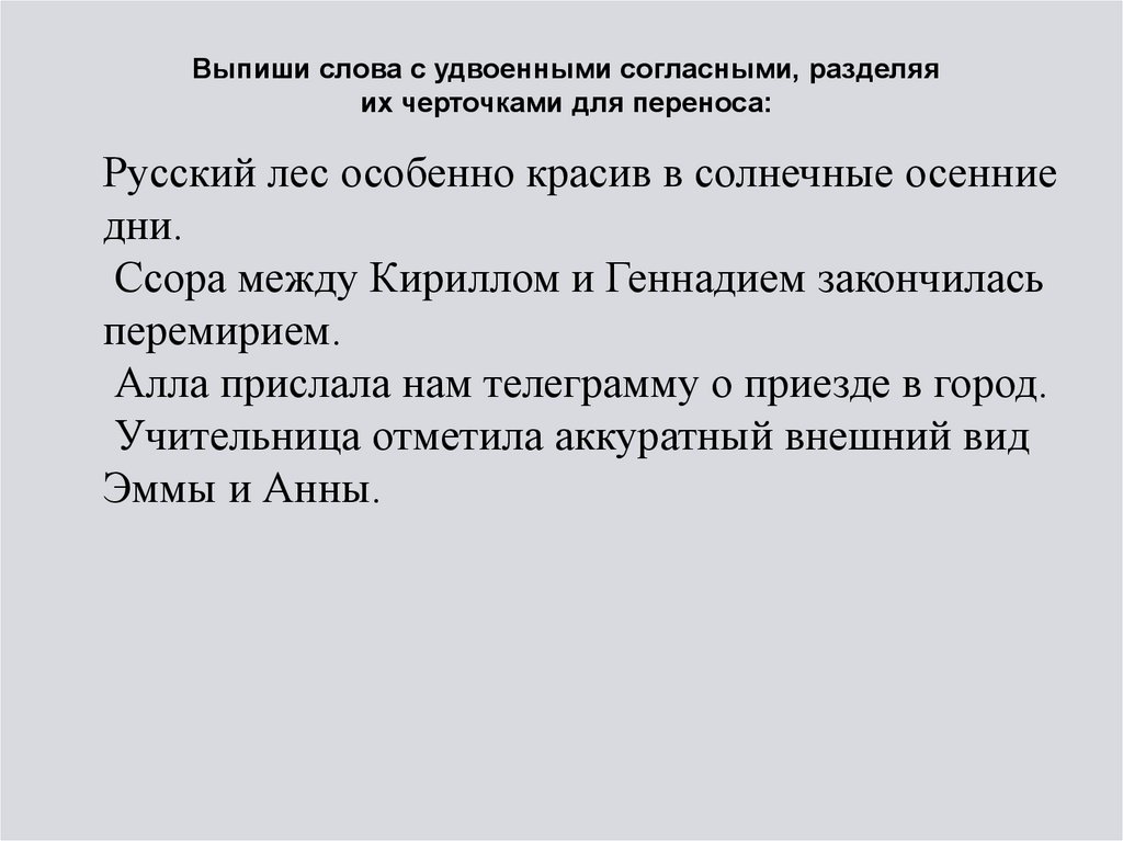 Выпиши слова с удвоенными согласными, разделяяих черточками для переноса: