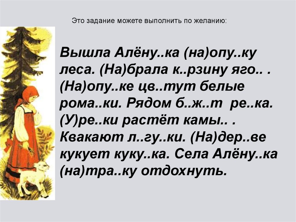 Это задание можете выполнить по желанию:Вышла Алёну..ка (на)опу..ку