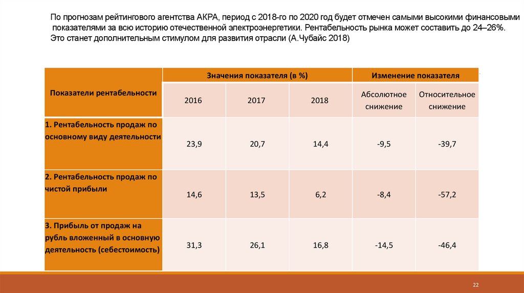 По прогнозам рейтингового агентства АКРА, период с 2018-го по 2020 год будет отмечен самыми высокими финансовымипоказателями за всю историю отечественной электроэнергетики. Рентабельность рынка может составить до 24–26%.