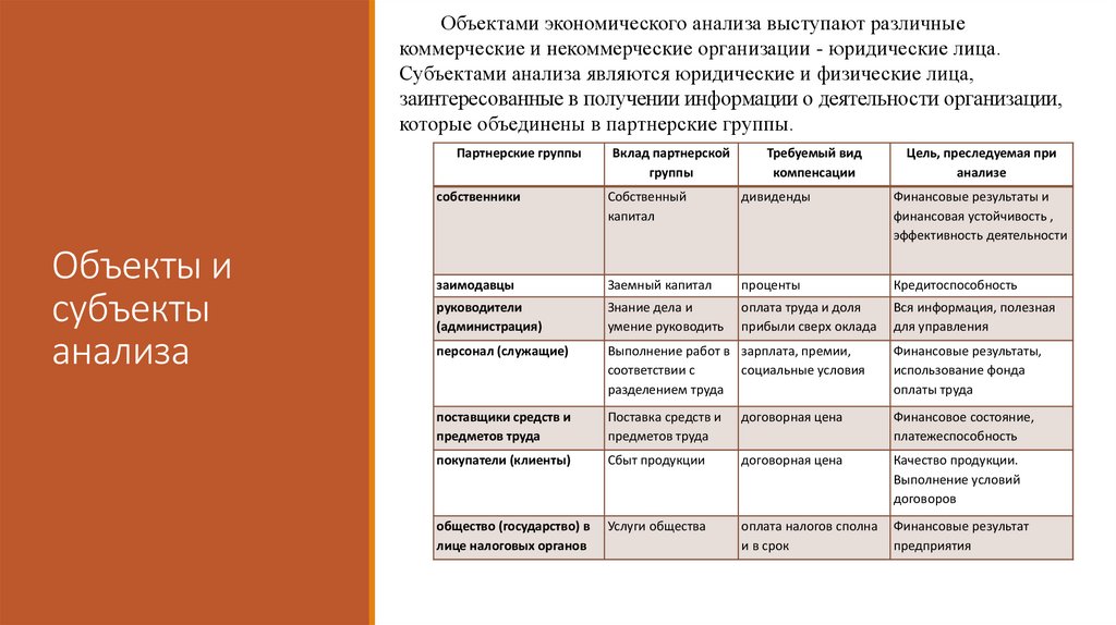 Объектами экономического анализа выступают различныекоммерческие и некоммерческие организации - юридические лица.
