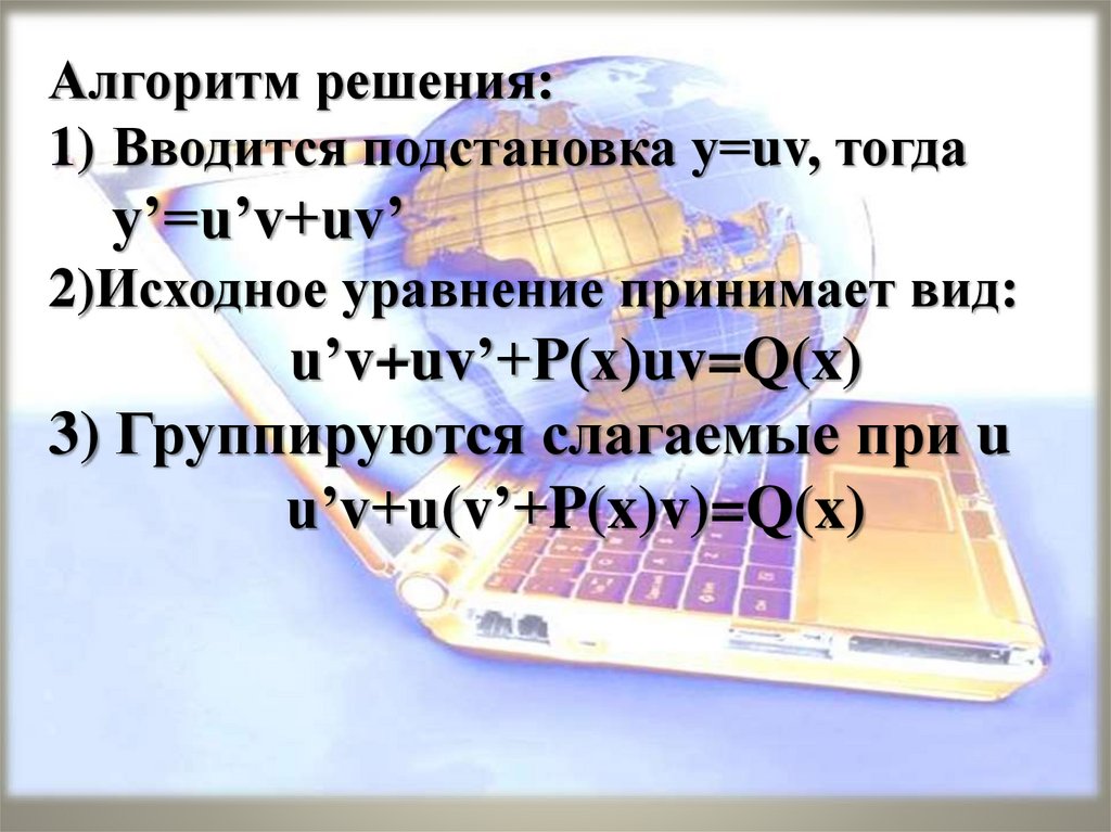 Алгоритм решения:1) Вводится подстановка у=uv, тогда
