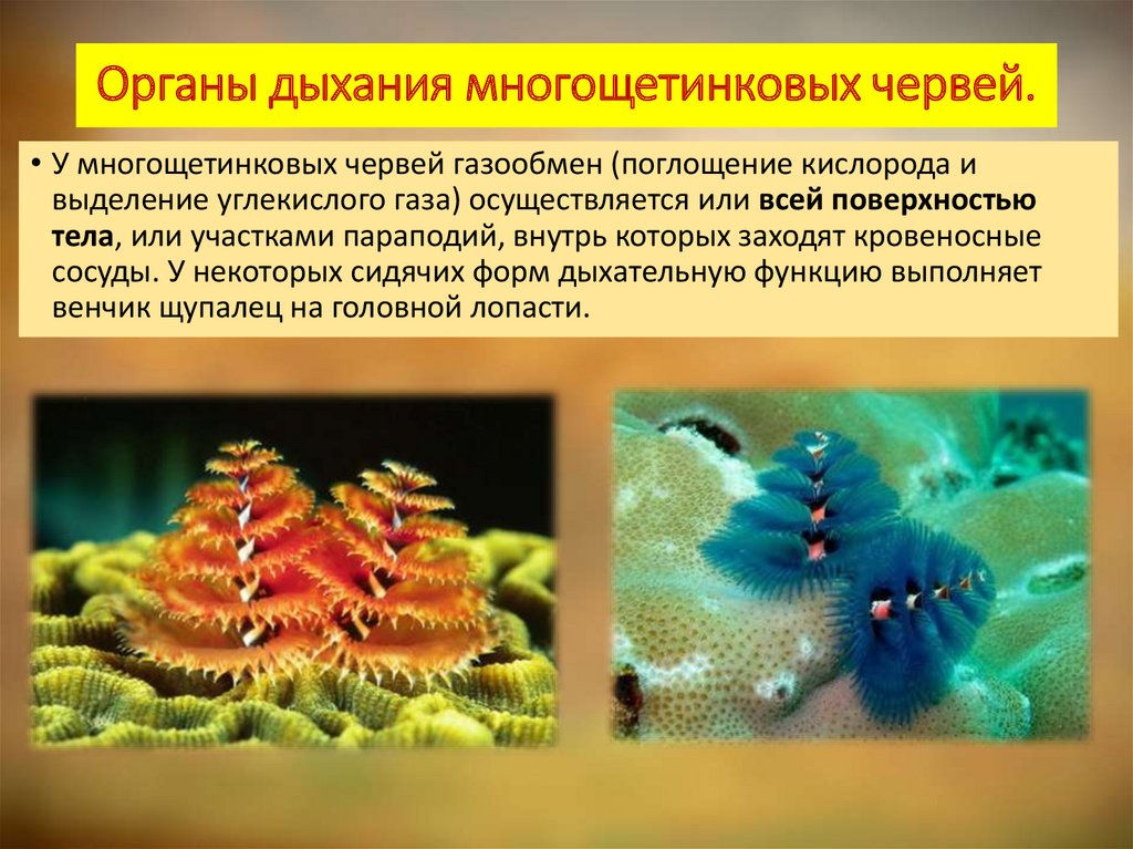 Органы дыхания многощетинковых червей.• У многощетинковых червей газообмен (поглощение кислорода и