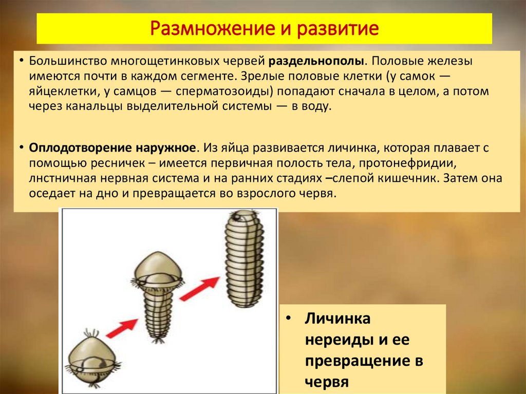 Размножение и развитие• Большинство многощетинковых червей раздельнополы. Половые железы
