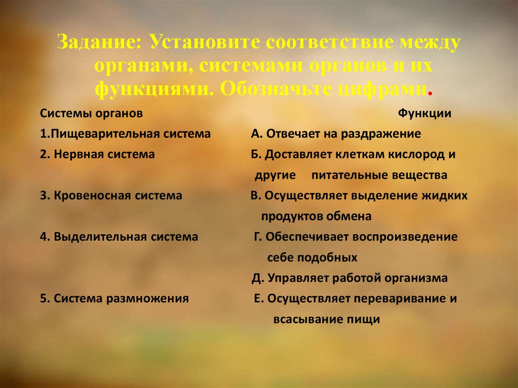 Задание: Установите соответствие междуорганами, системами органов и их