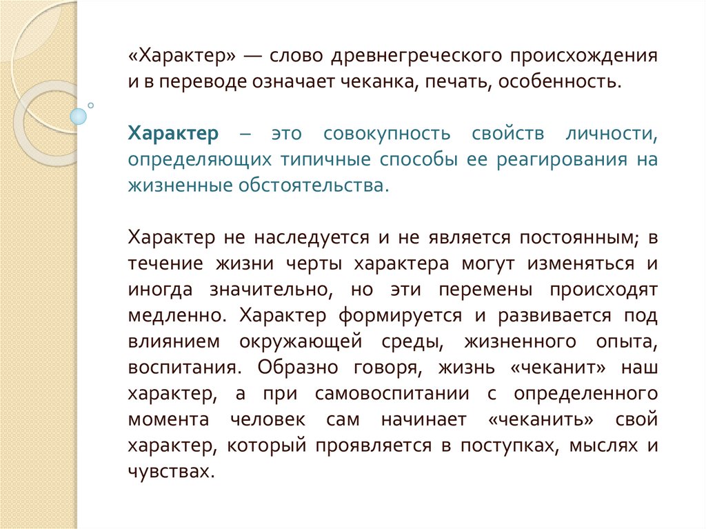 «Характер» — слово древнегреческого происхожденияи в переводе означает чеканка, печать, особенность.
