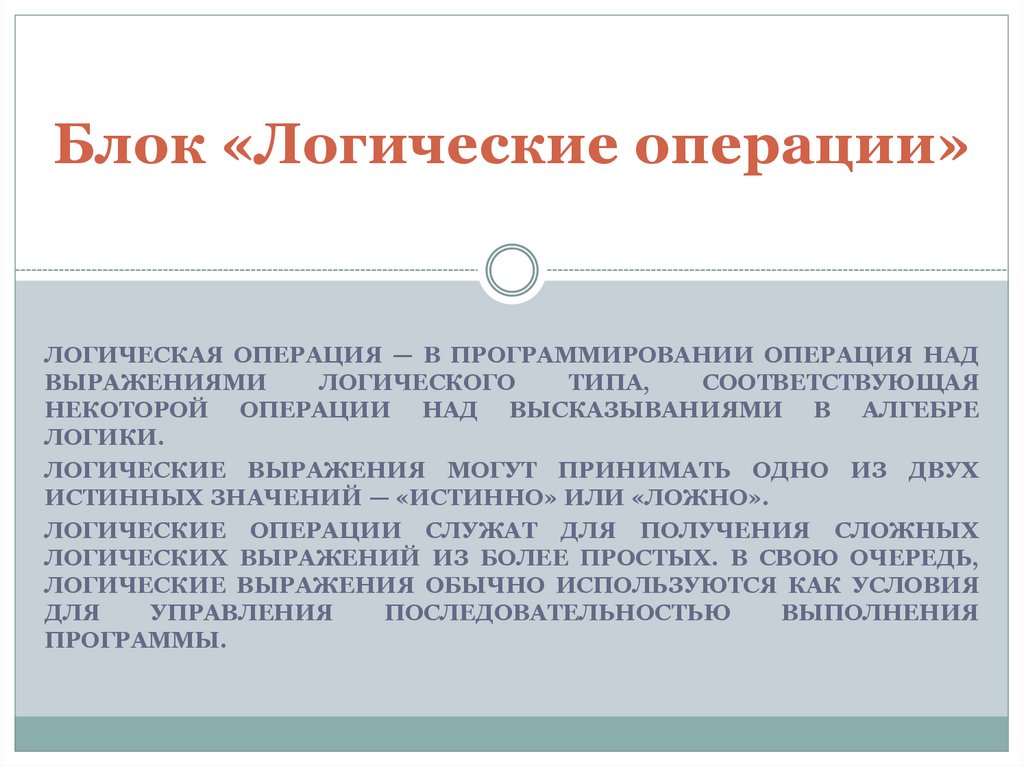 Блок «Логические операции»ЛОГИЧЕСКАЯ ОПЕРАЦИЯ — В ПРОГРАММИРОВАНИИ ОПЕРАЦИЯ НАД