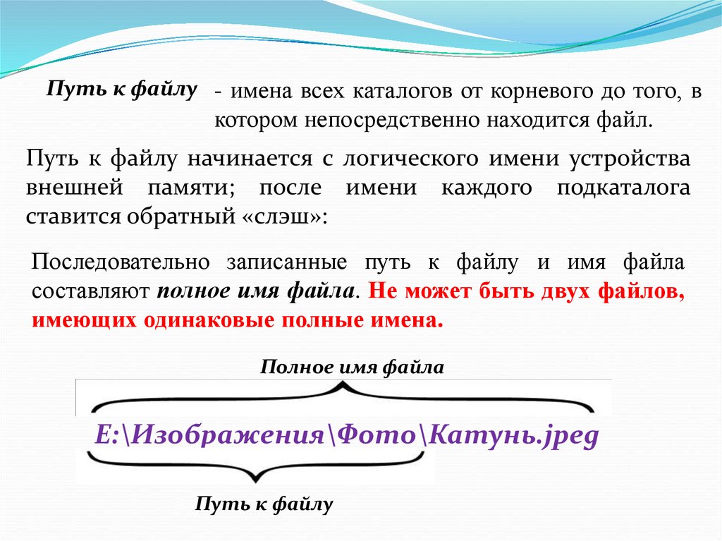 Путь к файлу - имена всех каталогов от корневого до того, вкотором непосредственно находится файл.