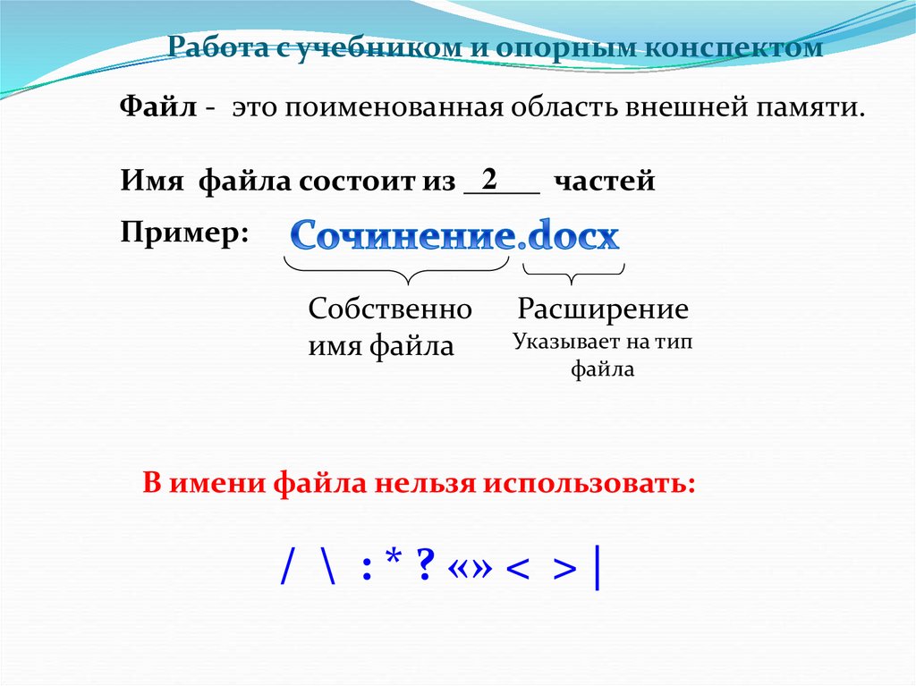 Работа с учебником и опорным конспектомФайл - это поименованная область внешней памяти.