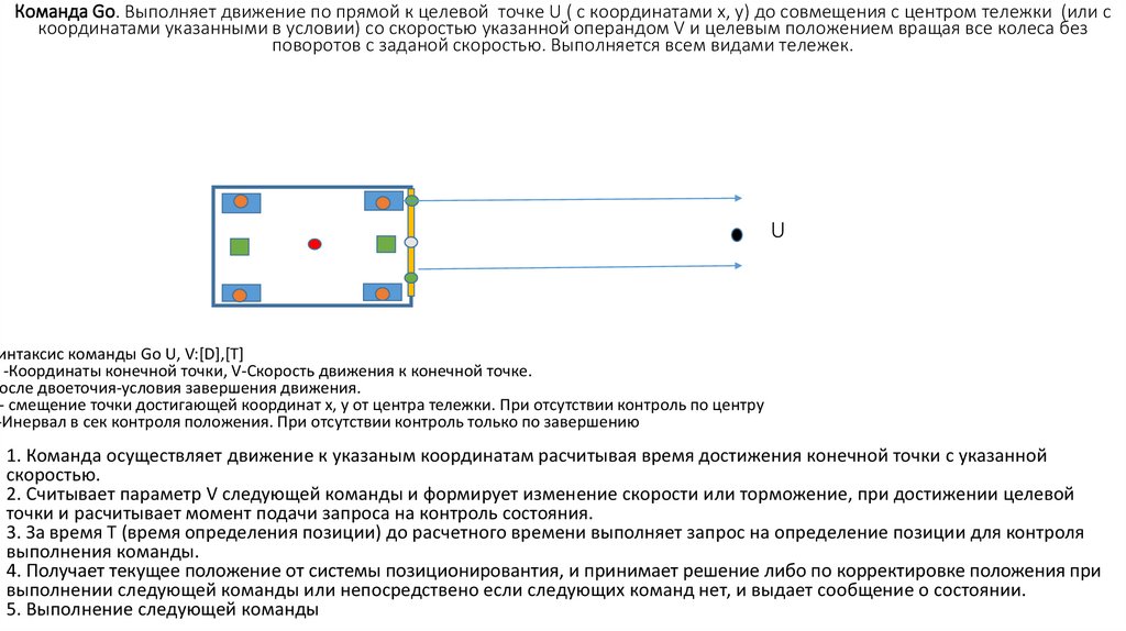 Команда Go. Выполняет движение по прямой к целевой точке U ( с координатами x, y) до совмещения с центром тележки (или скоординатами указанными в условии) со скоростью указанной операндом V и целевым положением вращая все колеса без
