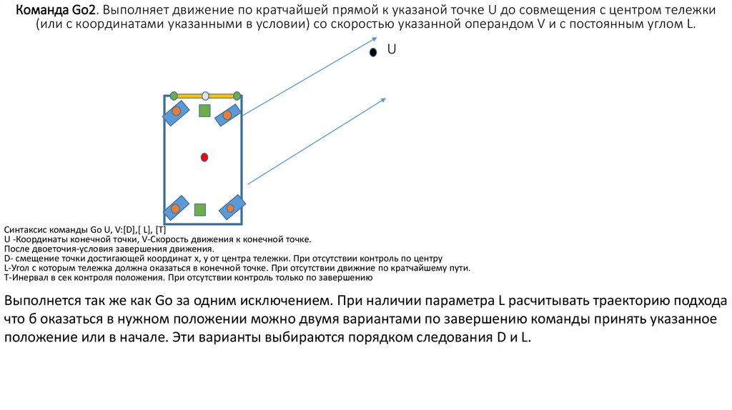 Команда Go2. Выполняет движение по кратчайшей прямой к указаной точке U до совмещения с центром тележки(или с координатами указанными в условии) со скоростью указанной операндом V и с постоянным углом L.