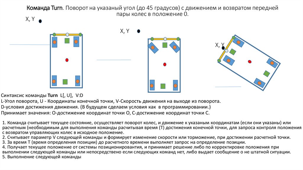 1. Команда считывает текущее состояние, осуществляет поворот колес, и движение к указаным координатам (если они указаны) или