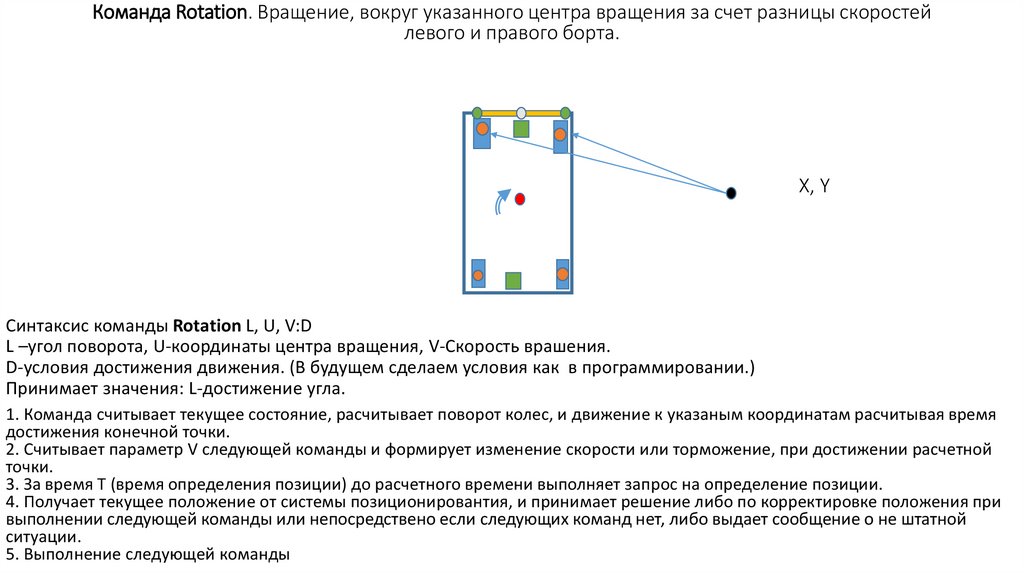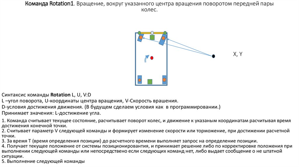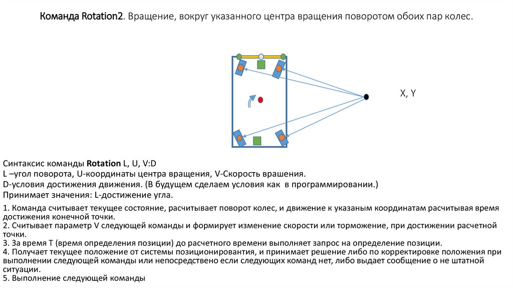 Команда Rotation2. Вращение, вокруг указанного центра вращения поворотом обоих пар колес.X, Y