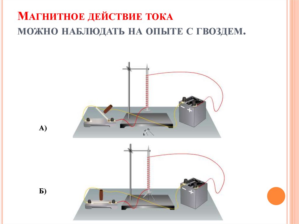МАГНИТНОЕ ДЕЙСТВИЕ ТОКАМОЖНО НАБЛЮДАТЬ НА ОПЫТЕ С ГВОЗДЕМ.