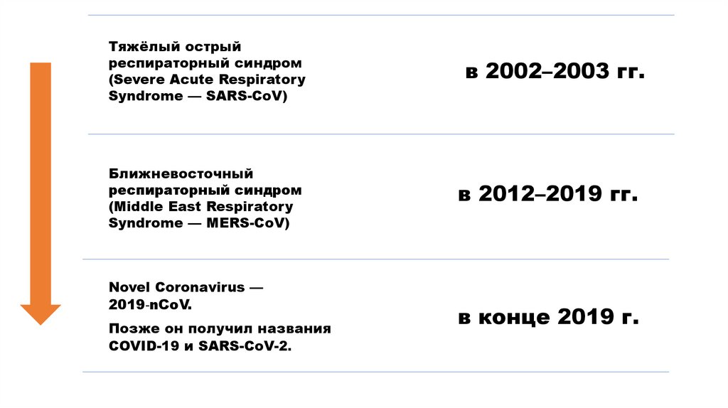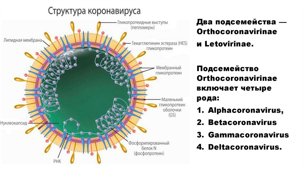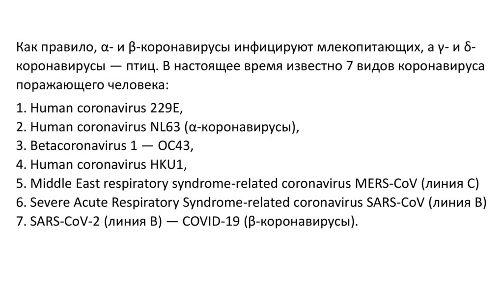 Как правило, α- и β-коронавирусы инфицируют млекопитающих, а γ- и δкоронавирусы — птиц. В настоящее время известно 7 видов коронавирусапоражающего человека: