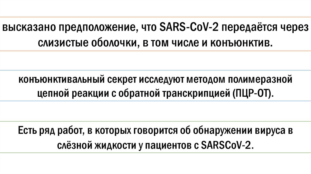 высказано предположение, что SARS-CoV-2 передаётся черезслизистые оболочки, в том числе и конъюнктив.