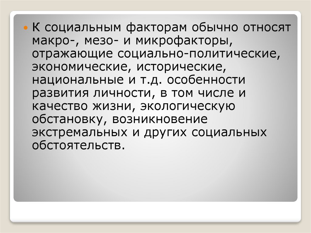 К социальным факторам обычно относятмакро-, мезо- и микрофакторы,