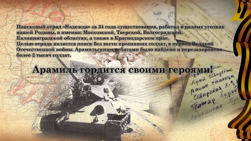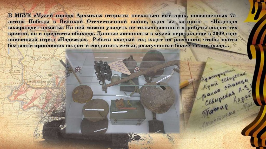 В МБУК «Музей города Арамиль» открыты несколько выставок, посвященных 75летию Победы в Великой Отечественной войне, одна из которых – «Надеждавозвращает память». На ней можно увидеть не только военные атрибуты солдат тех