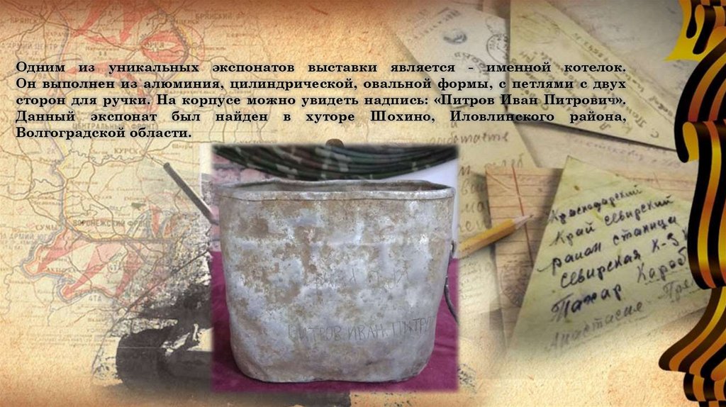 Одним из уникальных экспонатов выставки является - именной котелок.Он выполнен из алюминия, цилиндрической, овальной формы, с петлями с двух