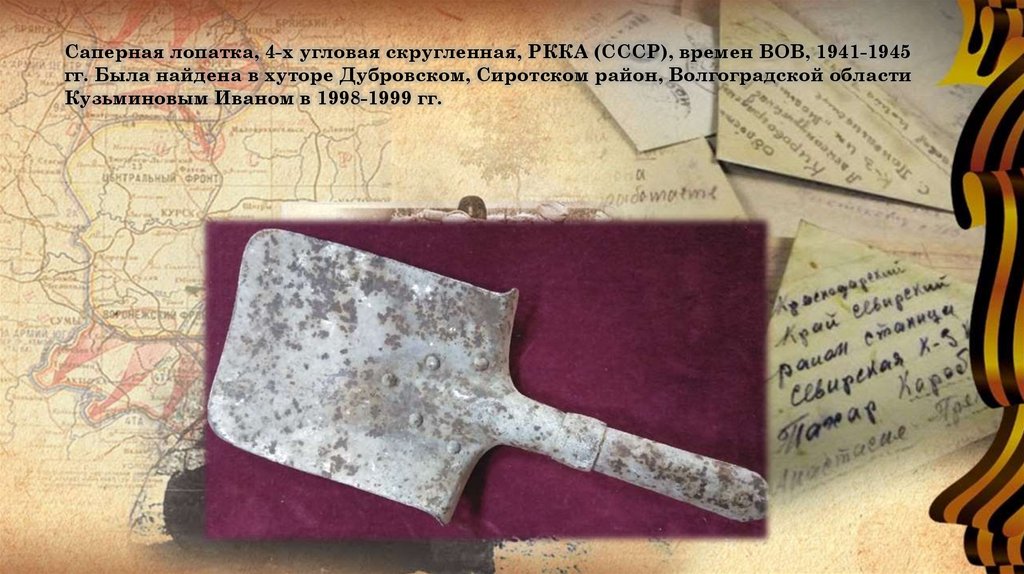 Саперная лопатка, 4-х угловая скругленная, РККА (СССР), времен ВОВ, 1941-1945гг. Была найдена в хуторе Дубровском, Сиротском район, Волгоградской области