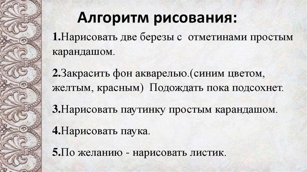 Алгоритм рисования:1.Нарисовать две березы с отметинами простым