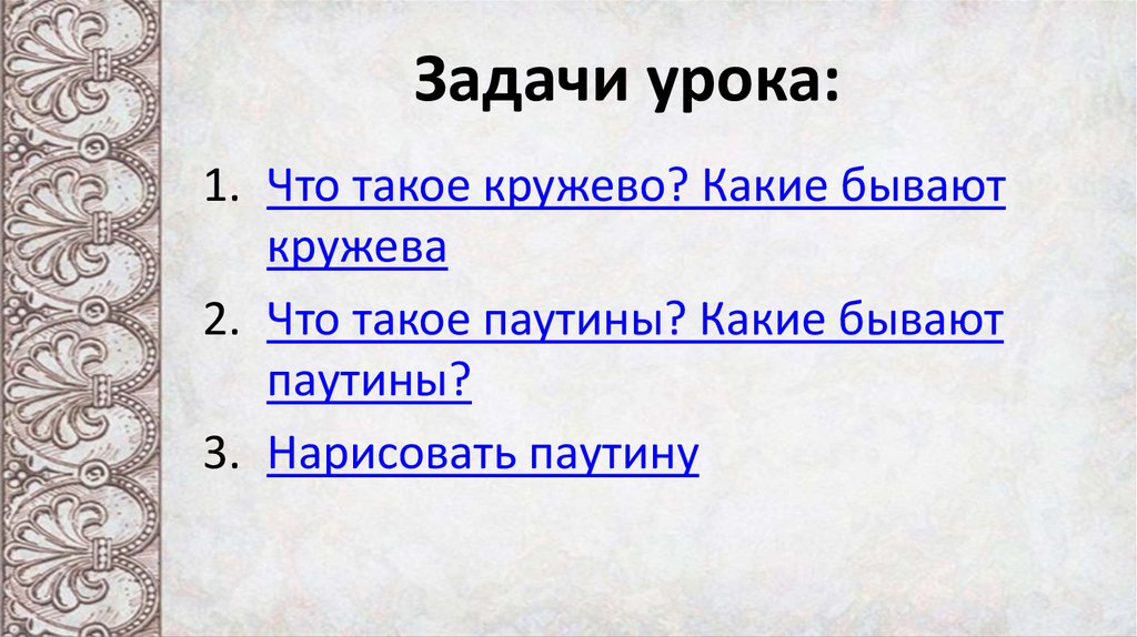 Задачи урока:1. Что такое кружево? Какие бывают