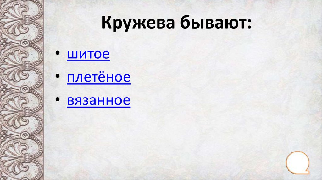 Кружева бывают:• шитое
